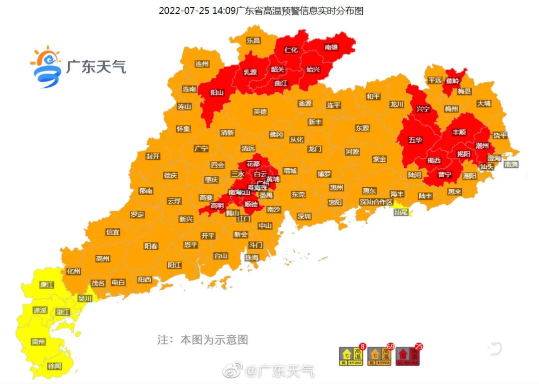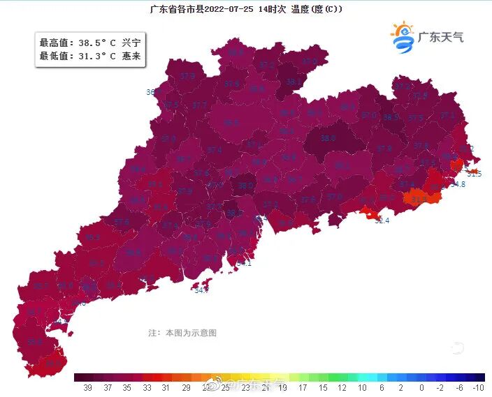 除了广州,广东其他城市当日也骄阳似火,“炙烤”模式持续。25日零时至19时,揭阳普宁最高气温达39℃,佛山顺德和梅州蕉岭最高气温达38.7℃。在广东天气发布的14时广东省各地温度分布图上,广东犹如一个被烤熟的紫薯,叫嚣着可怕的温度。