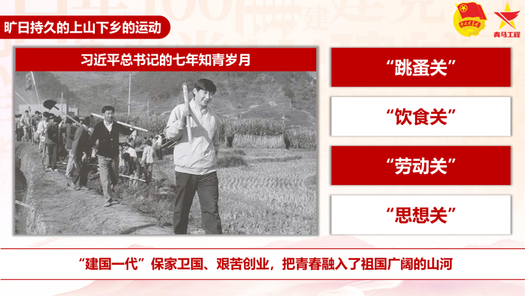 在《习近平七年知青岁月》一书中就曾记录过习近平总书记上山下乡的故事。1969 年,16岁的习近平,只身一人来到环境极为艰苦的陕西省延川县文安驿公社梁家河大队做知青,在这里, 他经受住了“跳蚤关、饮食关、劳动关、思想关”的严峻考验,一路克难题、增智慧,成长为了一名深受人民爱戴的青年干部。