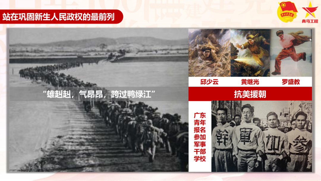 新中国建立之初,朝鲜爆发内战,美国随即出兵干涉并无视中国警告,把战火烧到了鸭绿江边。一番深思熟虑之后,毛主席大手一挥,“打的一拳开,免得百拳来”。中国人民志愿军于是雄赳赳,气昂昂,跨过鸭绿江。由于军事装备的落后,战争打的异常惨烈,但志愿军依然凭借“钢少气多”战胜了“钢多气少”。据统计,在抗美援朝战争中, 青年指战员占到了 66%,战斗连队中青年比例更是高达 80%。