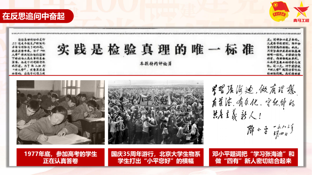 1978年12月,党的十一届三中全会开启了改革开放和社会主义现代化建设新时期,把全国工作中心转移到经济建设上来。东方风来满眼春。青年们乘着滚滚春潮,再次扬起浩浩风帆。在反思追问中奋起,中国青年开始从迷茫的状态下走出来, 以务实的姿态投身于改革开放的大潮之中。1977 年,高考制度在邓小平的建议下恢复,这不仅改变了几代人的命运,更为我国的发展和腾飞奠定了基础。邓小平题词把“学习张海迪”和做“四有”新人密切结合起来, 勉励青年做有理想、有道德、有文化、守纪律的共产主义接班人。![]()