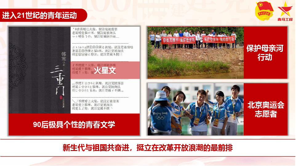 由于时代的发展速度远超观念的更新迭代,求变求新求异的80、90 一代一度被舆论批判为“垮掉一代”。然而在抗洪抢险、抗击非典、抗震救灾等各种急难险重任务之中,青年总是在党和人民需要的时候,冲得出来,顶得上去,承担了时代赋予的重任。用实际行动证明了青年一代有理想、有担当。