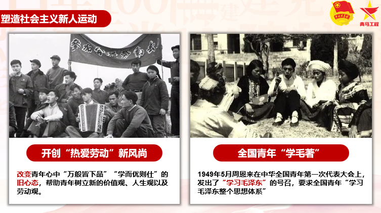 一穷二白的现状并没有吓退青年,他们高喊着“哪里有困难, 哪里就有青年突击队”。在建设原苏联展览馆的过程中,第一支青年突击队就此诞生。青年们活跃在工厂车间一线,用勤劳的双手和智慧的头脑为新生的共和国贡献着源源不断的发展动力。农村青年生产队,青年节约队、青年监督岗等一系列“青字号”生产组织与活动如雨后春笋般涌现,热火朝天的工作氛围让城市乡下处处洋溢着青春的热情和活力。青年的工作干劲得到了党中央高度认可,但党中央也对青年提出了新的期待,希望青年能成为革新道德规范、建立新的秩序的担当者。为此,全国青年积极参加塑造社会主义新人的运动,改变心中“万般皆下品”、“学而优则仕”的旧心态,树立新的价值观、人生观以及劳动观,努力开创“热爱劳动”的新风尚。与此同时,全国青年“学毛著”运动也如火如荼。1949年5月,周恩来在中华全国青年第一次代表大会上,发出了“学习毛泽东”的号召,要求全国青年“学习毛泽东整个思想体系”。