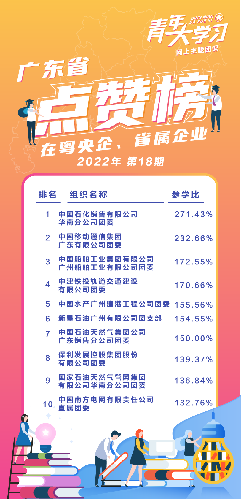 本周在粤央企、省属企业情况,平均总参学比80.38%。中国石化销售有限公司华南分公司、中国移动通信集团广东有限公司、中国船舶工业集团有限公司广州船舶工业有限公司、中建铁投轨道交通建设有限公司、中国水产广州建港工程公司、新星石油广州有限公司、中国石油天然气集团公司广东销售分公司、保利发展控股集团股份有限公司、国家石油天然气管网集团有限公司华南分公司、中国南方电网有限责任公司、广东省机场管理集团有限公司、中国图书进出口广州公司、中国储备粮管理集团有限公司广州分公司、中能建华南电力装备有限公司、广东省广轻控股集团有限公司、中国长城工业广州有限公司、广东省铁路建设投资集团有限公司、国家电力投资集团公司广东公司、中国轻工业广州工程有限公司、广东中烟工业有限责任公司、中远海运散货运输有限公司、中国邮政集团公司广东省分公司、中国石油化工集团公司广州分公司、广东省烟草专卖局(公司)、中国联合网络通信有限公司广东省分公司、广东电网有限责任公司等26家企业参学比超过100%。