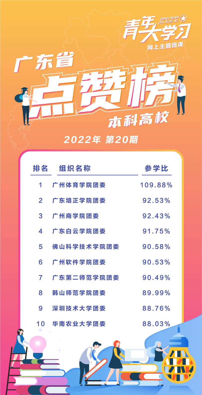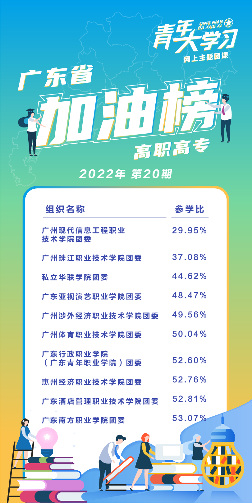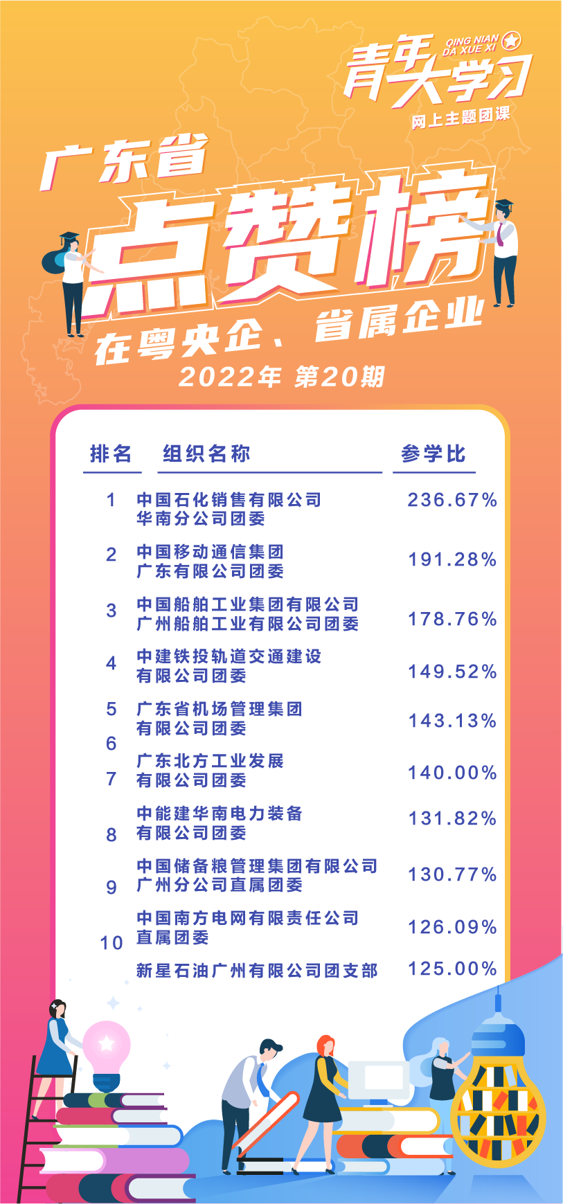 本周在粤央企、省属企业情况,平均总参学比85.91%。中国石化销售有限公司华南分公司、中国移动通信集团广东有限公司、中国船舶工业集团有限公司广州船舶工业有限公司、中建铁投轨道交通建设有限公司、广东省机场管理集团有限公司、广东北方工业发展有限公司、中能建华南电力装备有限公司、中国储备粮管理集团有限公司广州分公司、中国南方电网有限责任公司、新星石油广州有限公司、保利发展控股集团股份有限公司、中国图书进出口广州公司、广东省粤科金融集团有限公司、中远海运散货运输有限公司、中国轻工业广州工程有限公司、中交第四航务工程勘察设计院有限公司、中国邮政集团公司广东省分公司、广东省盐业集团有限公司、国家电力投资集团公司广东公司、中国石油天然气集团公司广东销售分公司、中交城市投资控股有限公司、中国广核集团有限公司、广州合成材料研究院有限公司、中国石油化工集团公司广州分公司、中国联合网络通信有限公司广东省分公司、广东省烟草专卖局(公司)、广东电网有限责任公司、广东省铁路建设投资集团有限公司等28家企业参学比超过100%。