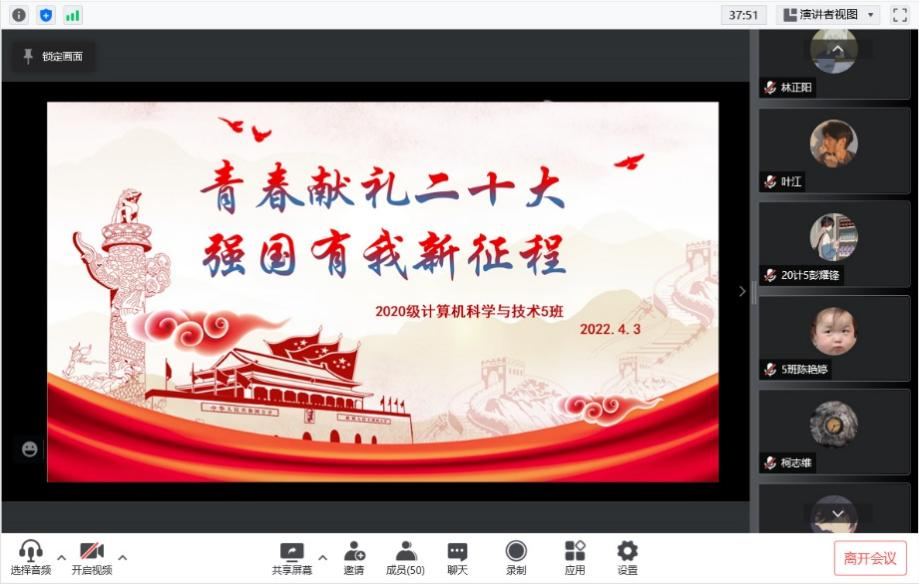 广东白云学院2020级计算机科学与技术5班团支部成立于2020年9月,团支部有共青团员32名,其中,有7名入党积极分子,3名预备党员。自成立以来,团支部认真有效地完成上级交代的各项任务,积极开展各项活动,皆取得了不错的成绩。同学们踊跃参加活动,学好专业知识,不断在实践中检验自己、挑战自己,以新时代团员的高标准来严格要求自己,用先进的思想理论武装自己的头脑,以团支部建设为重点,提高思想觉悟、强化专业技能。志存高远、脚踏实地、不负时代、不负韶华!
