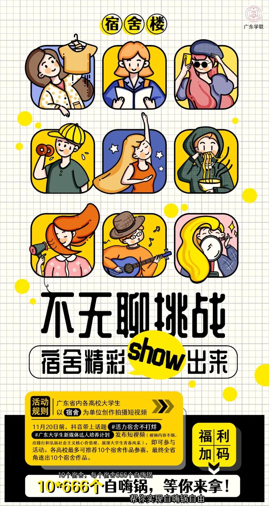 记得在11月20号前,抖音带上话题#活力宿舍不打烊#广东大学生新媒体达人培养计划发布短视频;