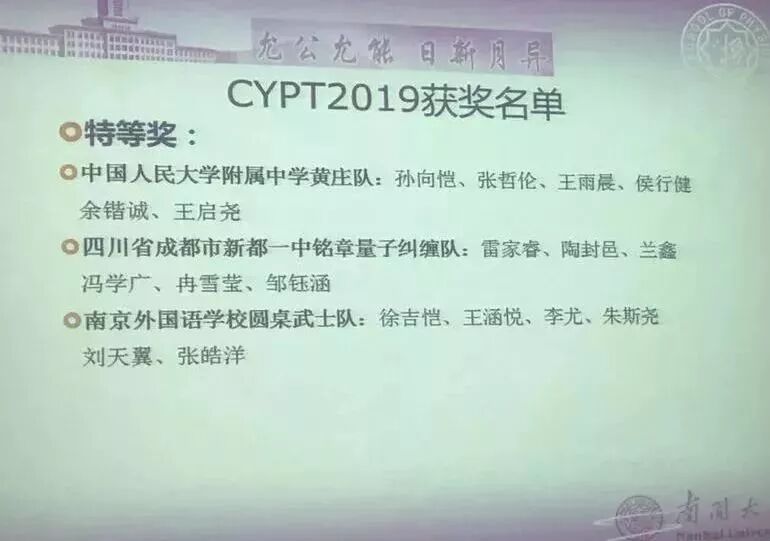 在2019年中国高中生物理学术竞赛中,由新都一中铭章学院组的“铭章量子纠缠队”在全国30所重点高中中,以循环赛第二的成绩入围全国决赛,与中国人民大学附属中学、南京外国语学校同场竞技,最终获得亚军,力斩特等奖,这是国内物理研究性竞赛的最高奖项,创造四川省及新都一中在此赛事上的最好成绩!