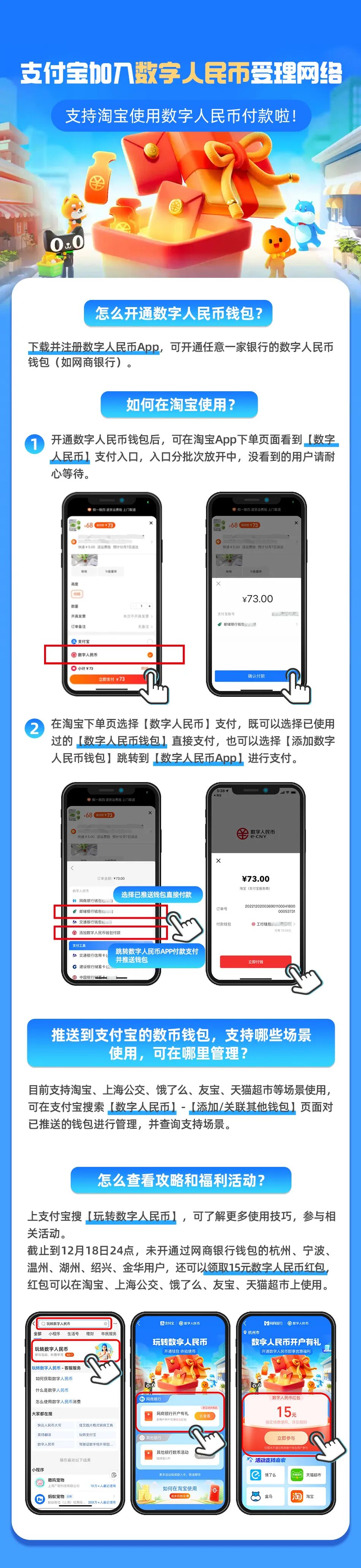 同时,在淘宝、上海公交、饿了么、天猫超市、盒马、喜马拉雅等app上买东西,可以用数字人民币付款啦!还不知道怎么用的朋友,可上支付宝搜【玩转数字人民币】,查看使用技巧和福利活动,也可以存下这张图~