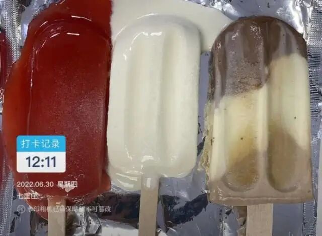 为了观察雪糕融化速度,我们选取市面上常见的山楂口味雪糕(左)、酸奶味雪糕(中)和牛奶咖啡口味雪糕(右)进行对比。三支雪糕自冷柜取出室内放置十分钟后,其外观并无明显变化。