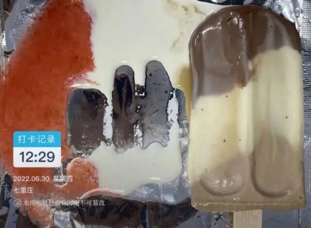 三支雪糕自冷柜取出后50分钟左右再观察,山楂口味和酸奶口味雪糕已经完全融化,而牛奶咖啡口味雪糕仅四周有轻微融化,雪糕外形仍清晰可见,整体融化程度并不明显,也并没有化成液态。