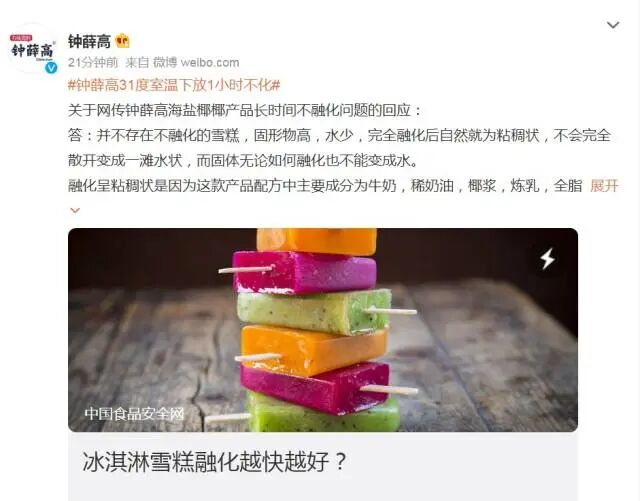 关于网传钟薛高海盐椰椰产品长时间不融化问题的回应: