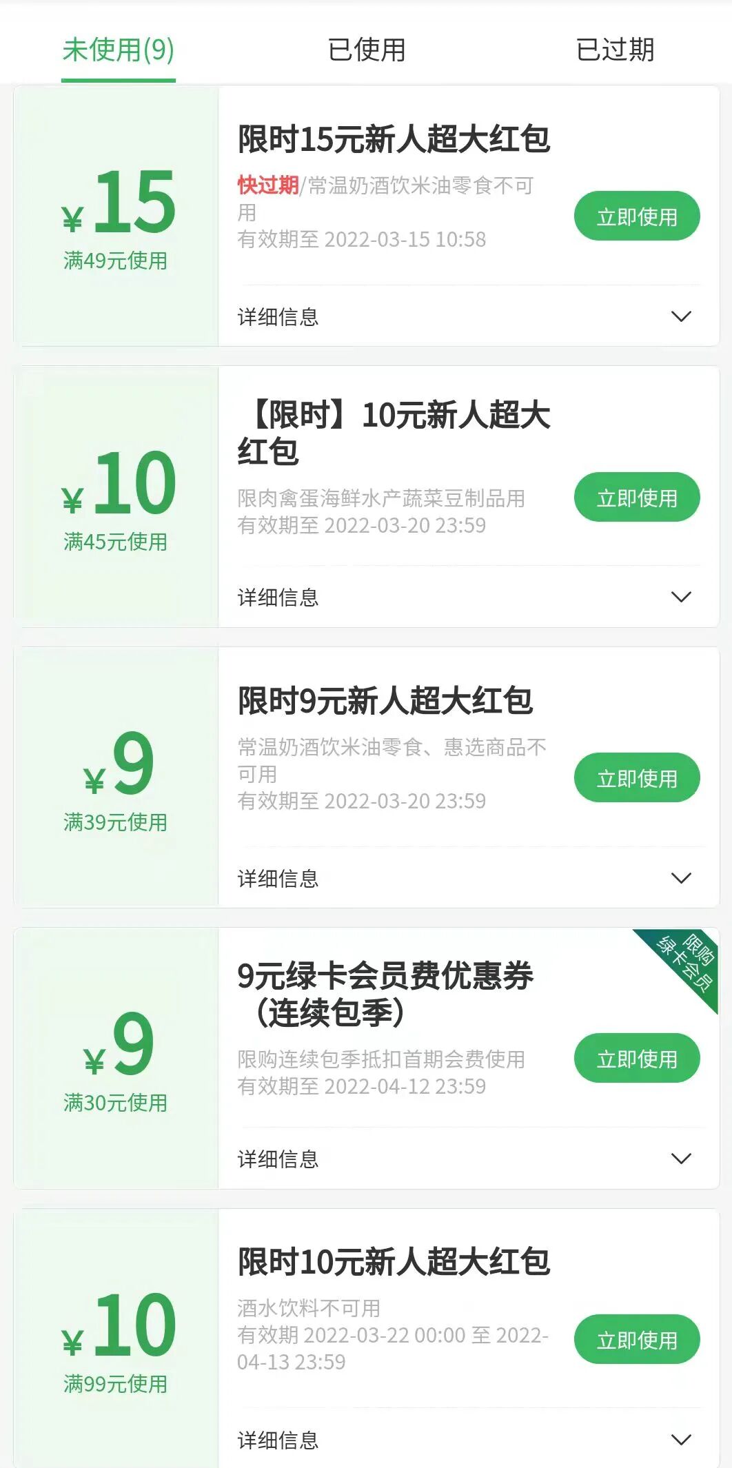 早市满49减15,午市也有20、30元的优惠券。不同时间段的生鲜精选,有不同的优惠,可以根据需求购买~