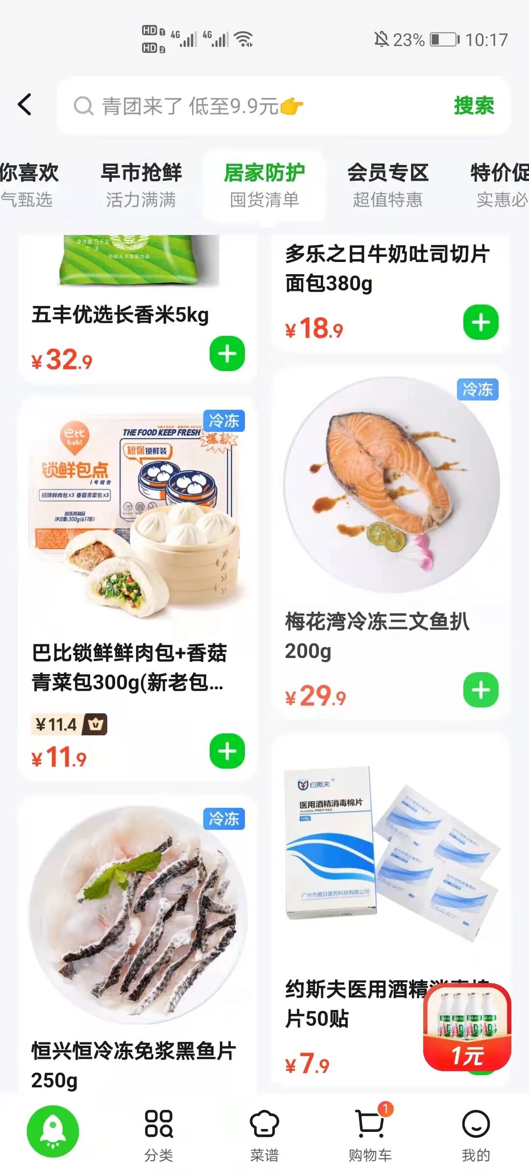 特殊的防疫板块,十分贴心。居家需要的生鲜零食,防疫需要的口罩消毒用品,都有。