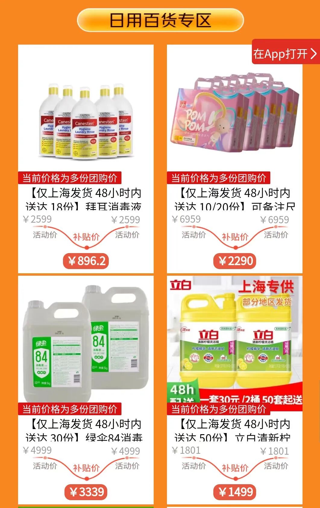 上海48小时送达,可团购食品生鲜和日用百货。