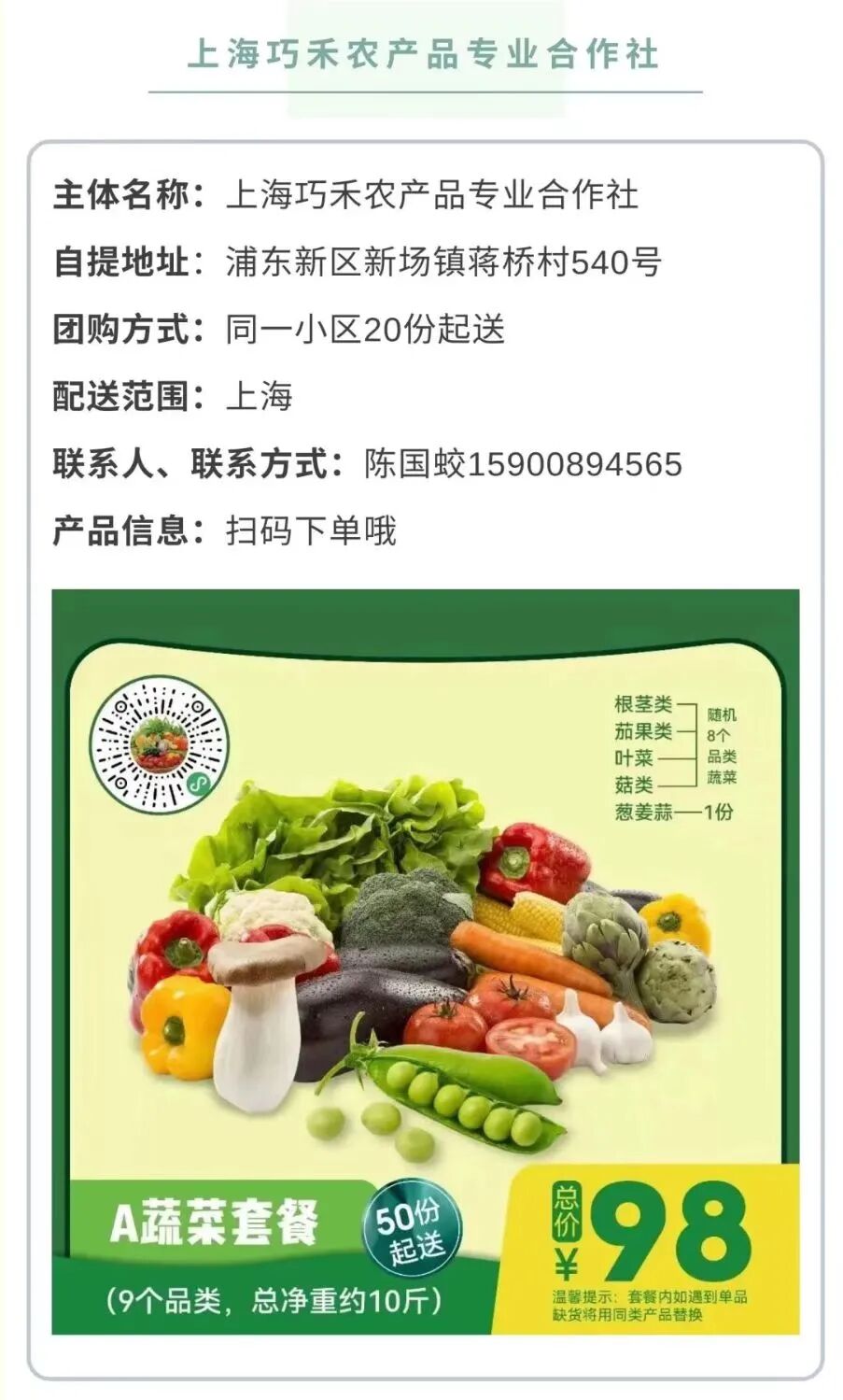 套餐1:蔬菜包(青菜、杭白菜、茼蒿、莴笋、番茄、黄瓜等随机搭配,约6斤);