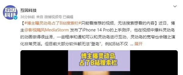 博主@影视飓风MediaStorm发布了iPhone 14 Pro的上手测评视频,他在视频中称,灵动岛的动画很丝滑,一些程序和通知可以和灵动岛进行互动,灵动岛的宽窄也会随之演化,非常灵活。但目前大部分软件都无法“登岛”,例如,B站不仅没登上灵动岛,搜索栏区域还被灵动岛占了,自己只能看推荐的视频,无法搜索想看的内容。对此,该博主表示,相信各大软件应该会很快适配灵动岛,这不用担心,但现在的话,你需要接受它的不完美。