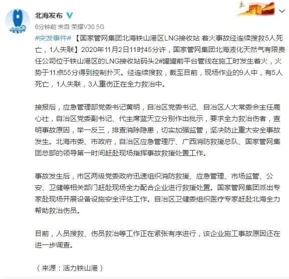 11月3日,北海市人民政府新闻办公室官方微博“北海发布”公布一则有关国家管网集团北海铁山港区LNG接收站着火事故的最新消息。