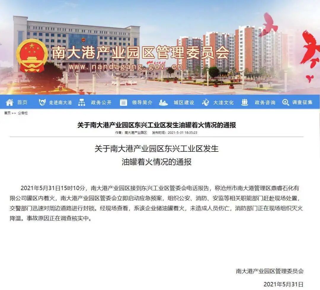 据河北沧州市南大港产业园区管理委员会官网消息,5月31日15时10分,南大港产业园区接到东兴工业区管委会电话报告,称沧州市南大港管理区鼎睿石化有限公司罐区内着火,南大港产业园区管委会立即启动应急预案,组织公安、消防、安监等相关职能部门赶赴现场处置,交警部门迅速对周边道路进行封锁。