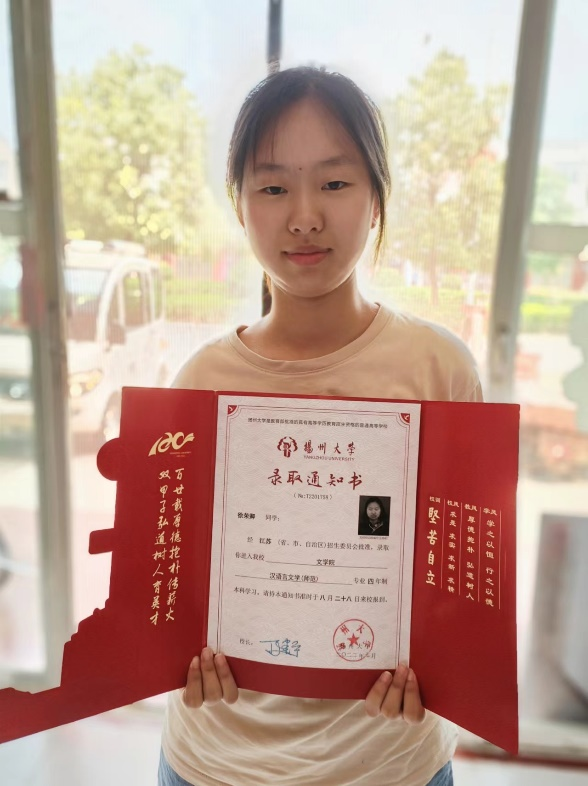 跋涉出十二载时光苦旅,我很高兴拿到了扬州大学录取通知书,这封红彤彤沉甸甸扬大录取通知书,不仅是对我高中的一份肯定,而且是一个新的开始、新的征程。在未来的大学生活中,我会朝着自己的目标不断拼搏,与扬大的老师们同学们向着梦想一路同行。以梦为马,不负韶华,希望未来在扬大校园,遇见更好的自己!