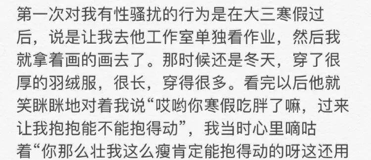 有受害人称,在晚上十二点接到姚的电话,叫去工作室看画,姚会借机动手动脚,他还说“如果你想当我的研究生,就不要找男朋友。”