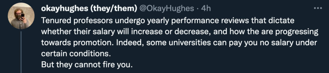 「顺便说一下,有很多关于终身教职生产力的学术研究,一个普遍的发现是:高级教职员工们的工作量与他们获得教职前一样多,但通常是以不同的方式。」与此同时,还存在一个问题:「终身教职是一种契约,某些深奥的领域通常需要人们花费数年来钻研,同时意味着巨大机会成本牺牲。」![]()