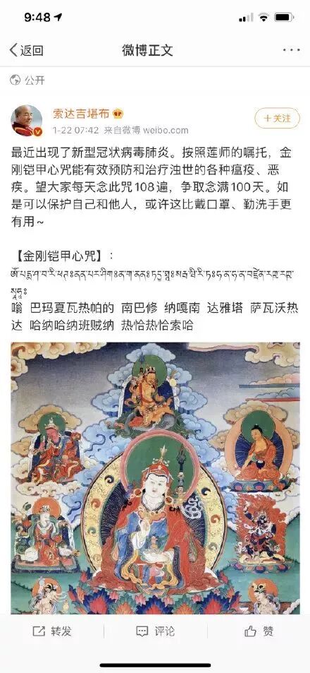 像这种利用大家的恐惧,为自己谋取利益的人,绝对不是蠢,这就是实打实的坏。再重复一遍,武汉封城了,说明事情已经到非常严重的地步了,我们每个人都应该严肃对待。尽量听从专业人士安排,不要抱有侥幸心理,更不要作恶浑水摸鱼。事情都到这份上了,能有点良心,别给奋战在一线的医护人员,别给专业人士添乱了行吗?这种病毒是所有人类的敌人,尽量配合专业人士战胜它,是所有人类的应尽的责任。我们避无可避,无路可退。其实作为个人,要做的也不多,武汉协和刚刚发布了第三版的协和《疫情解决方案》,里面提出了以下几点:1,外出时一定要戴口罩,尤其是就医时一定一定要戴口罩。4,多看官媒,多看权威媒体,包括“丁香医生”这种大型医疗媒体,不要信什么特效药,现在还没有特效药。更不要信什么念经治病比戴口罩更有用,这都是骗你的: