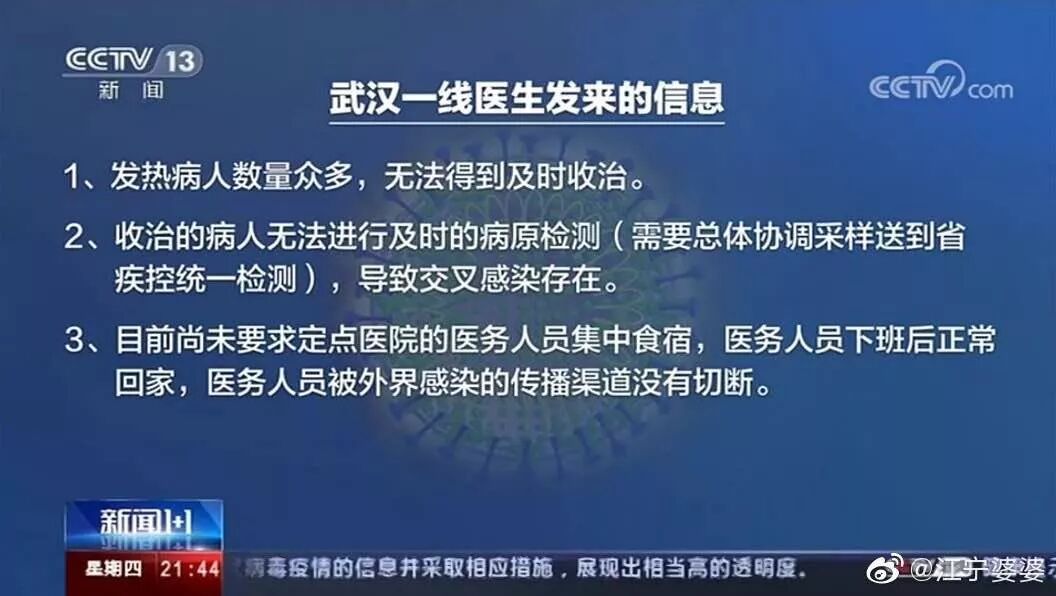 5,如果您来自疫区,或有发热、干咳、全身无力等症状,请主动到社居委等级并进行体温检测,请持续观察自己的健康状况14天,尽量不要去触碰别人。我们应该有打一场硬仗的觉悟,应该团结起来,负起自己的责任,每个人都保护好自己,都做好自己该做的。有许多医护人员,自愿前往武汉,补充武汉的医疗资源:关于之前防控过程中出现的问题,央视新闻也当作大事在讨论解决方案了: