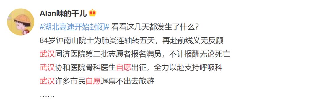 武汉壮士断腕啊。关闭武汉这样超大省会城市的外出通道,这是新中国的头一遭。武汉人民在为了控制疫情、减少全国其他地区的风险做出巨大的付出。难为你们了武汉人。老胡和全国各地的粉丝向你们致敬。我相信全国人民都会向你们致以深深的敬意。我们会一直和你们在一起。 挺住武汉!