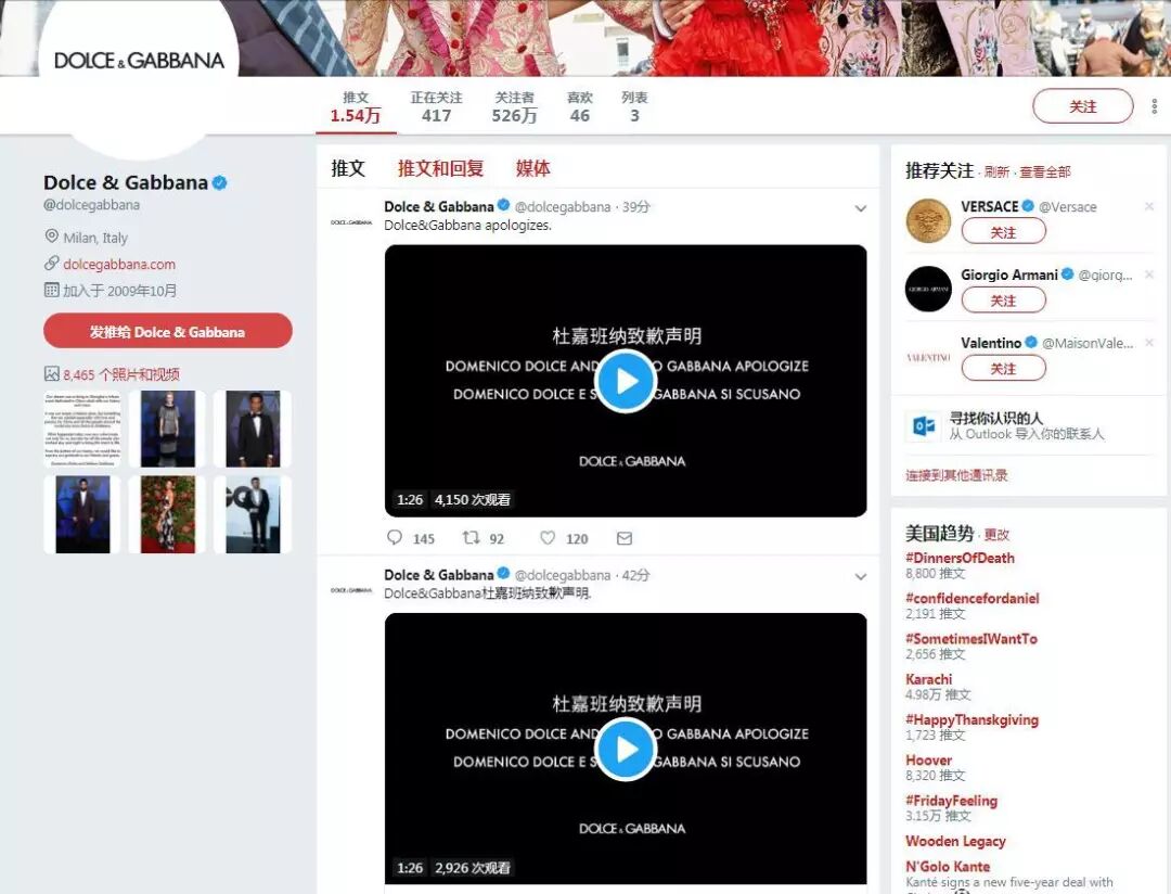 四个小时后,11月23日17时许,杜嘉班纳终于在海外官方社交账号脸谱、推特和Ins上更新两位创始人的道歉视频。