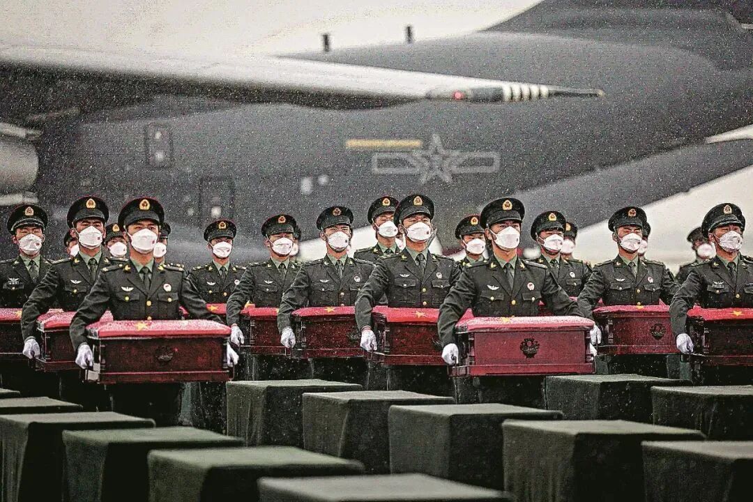 在沈阳桃仙国际机场,礼兵在雨中将殓放志愿军烈士遗骸的棺椁从专机上护送至棺椁摆放区。