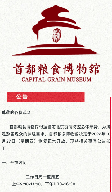 首都粮食博物馆于2022年10月27日(星期四)恢复正常开放。开放时间为工作日周一至周五上午9:30-11:30,下午1:30-16:30。