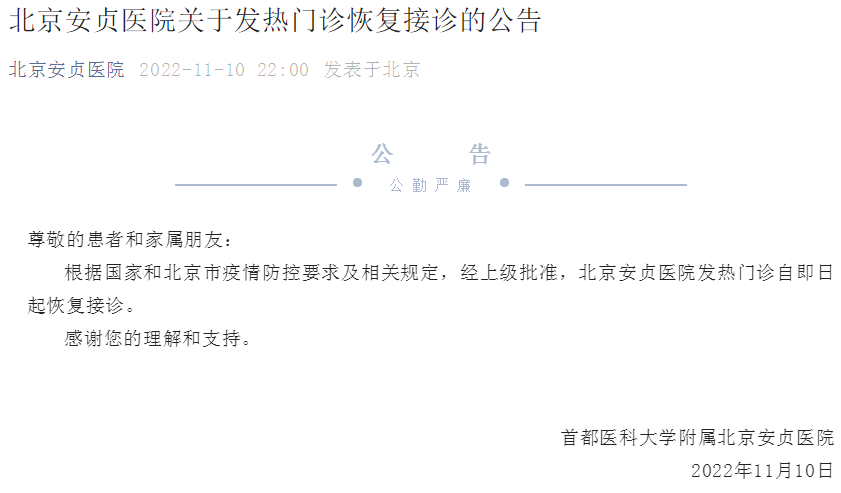 此外,11月10日晚,首都医科大学附属北京安贞医院发布公告称,根据国家和北京市疫情防控要求及相关规定,经上级批准,北京安贞医院发热门诊自即日起恢复接诊。
