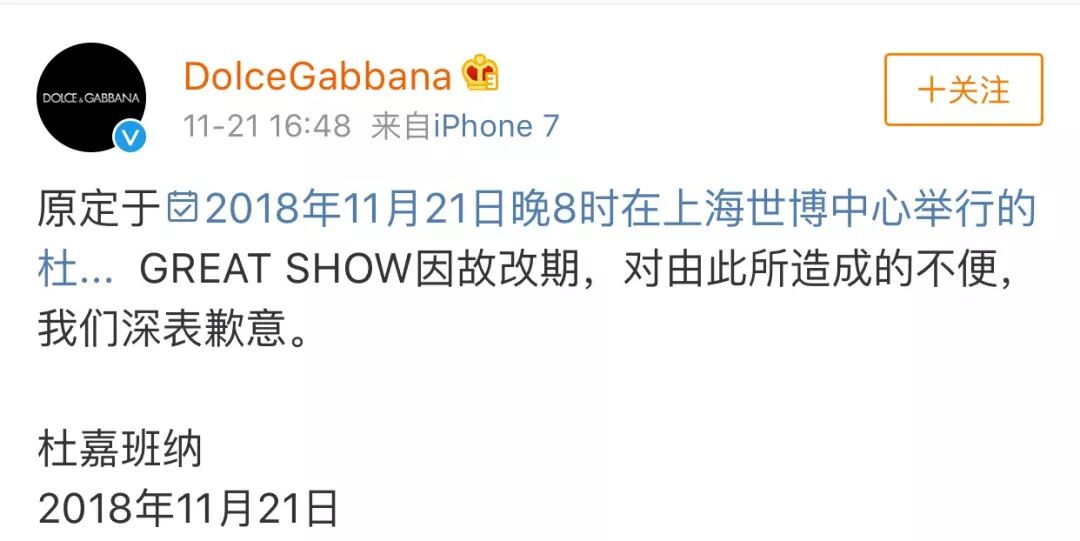 刚刚,杜嘉班纳通过官方微博@DolceGabbana 宣布,原定于11月21日晚8时举行的时装秀因故改期。