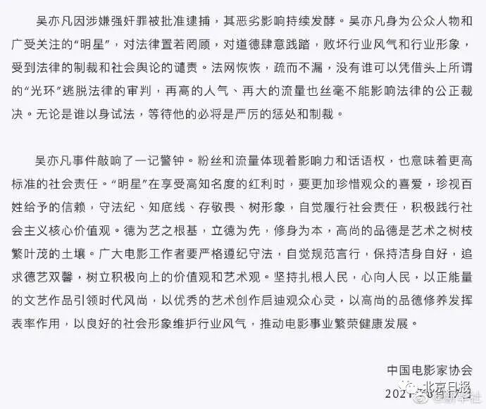 中国电影家协会表示,法网恢恢,疏而不漏,没有谁可以凭借头上所谓的“光环”逃脱法律的审判,再高的人气、再大的流量也丝毫不能影响法律的公正裁决。