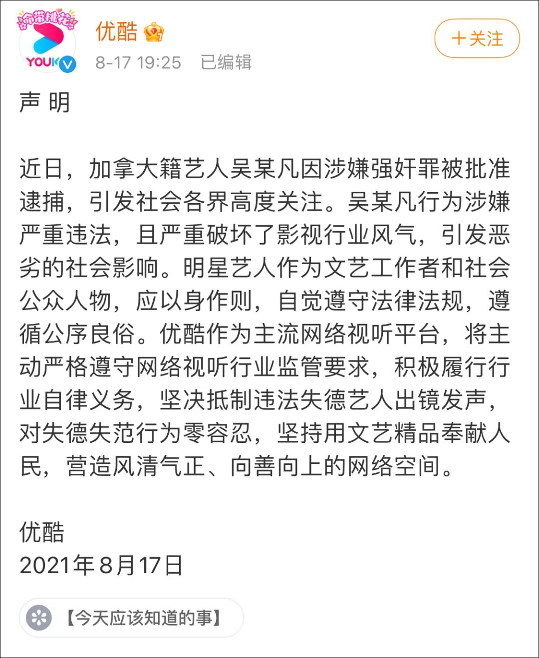 中国网络视听节目服务协会坚决支持会员单位采取的联合行动,支持下架吴某凡参演的影视综艺节目。协会重申,绝不为违法失德人员提供出镜发声的机会和平台,绝不让这些人员和作品在网络视听行业有立足之地。娱乐圈不是恣意妄为的法外之地。一些明星艺人不讲职业道德,缺乏艺术操守,突破法律道德底线,金玉其外,败絮其中,理应受到严厉的惩罚,必须付出应有的代价。