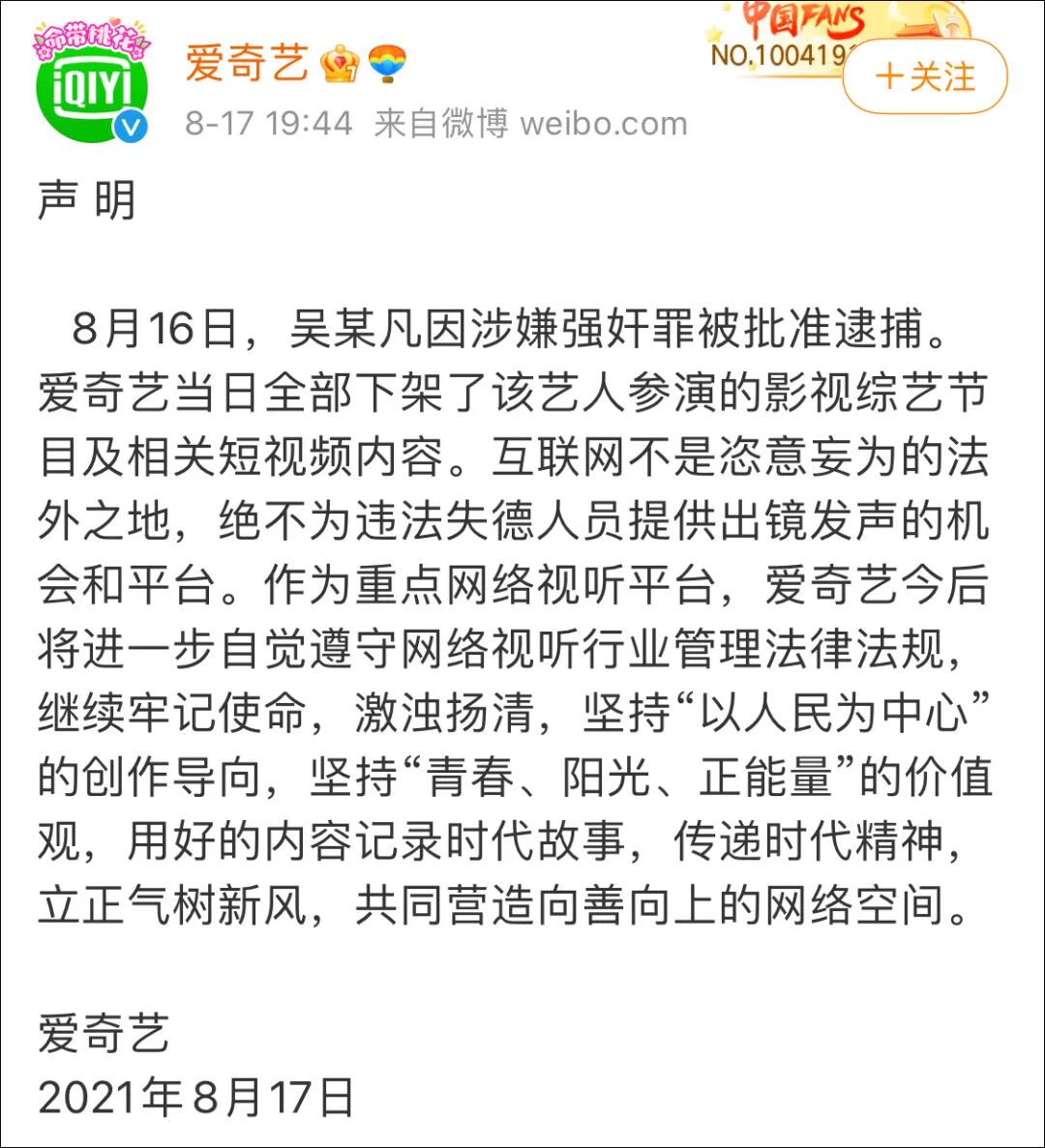 其中,优酷、爱奇艺、腾讯等各大网络视听平台已经下架了吴某凡的相关作品;与吴某凡有品牌合作的腾讯视频更是在事件发生伊始便迅速向其发出解除合作通知、终止一切合作;芒果TV日前联合80余位艺人签署了《自觉践行崇德尚艺努力做新时代文艺工作者承诺书》;百度已经给吴某凡打上了“违法失德艺人”数据标签;微博已经禁言了吴某凡个人和工作室的帐号等等。