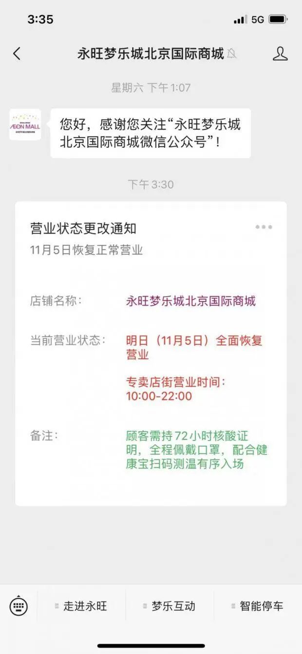 据永旺梦乐城北京国际商城微信公众号11月4日消息,11月5日,商城全面恢复正常营业,顾客需持72小时核酸证明,全程佩戴口罩,配合健康宝扫码测温有序入场。