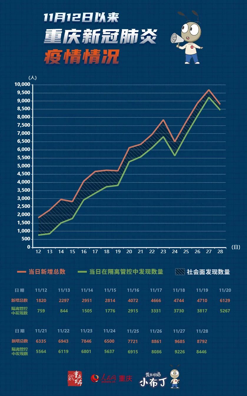 11月28日0至24时,31个省(自治区、直辖市)和新疆生产建设兵团报告新增确诊病例3624例。其中境外输入病例63例(广东19例,北京16例,福建7例,上海6例,江苏4例,浙江2例,重庆2例,四川2例,内蒙古1例,辽宁1例,山东1例,湖北1例,陕西1例),含7例由无症状感染者转为确诊病例(浙江2例,广东2例,江苏1例,福建1例,重庆1例);本土病例3561例——