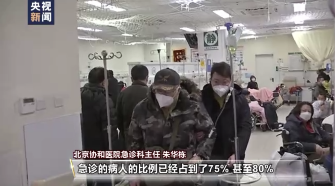 北京协和医院急诊科主任朱华栋说:“我从医大概有30来年了,可以说是最困难的一个时候。病人量多,还有危重程度也超过平时。像在以往的话,一、二、三级占的比例平均平时在50%左右,最近这几天我们监测到一、二、三级这些急诊的病人比例已经占到了75%,甚至80%,危重病人的比重高,可以说这是一个前所未有的挑战。”