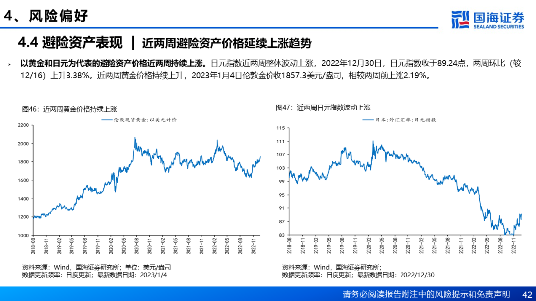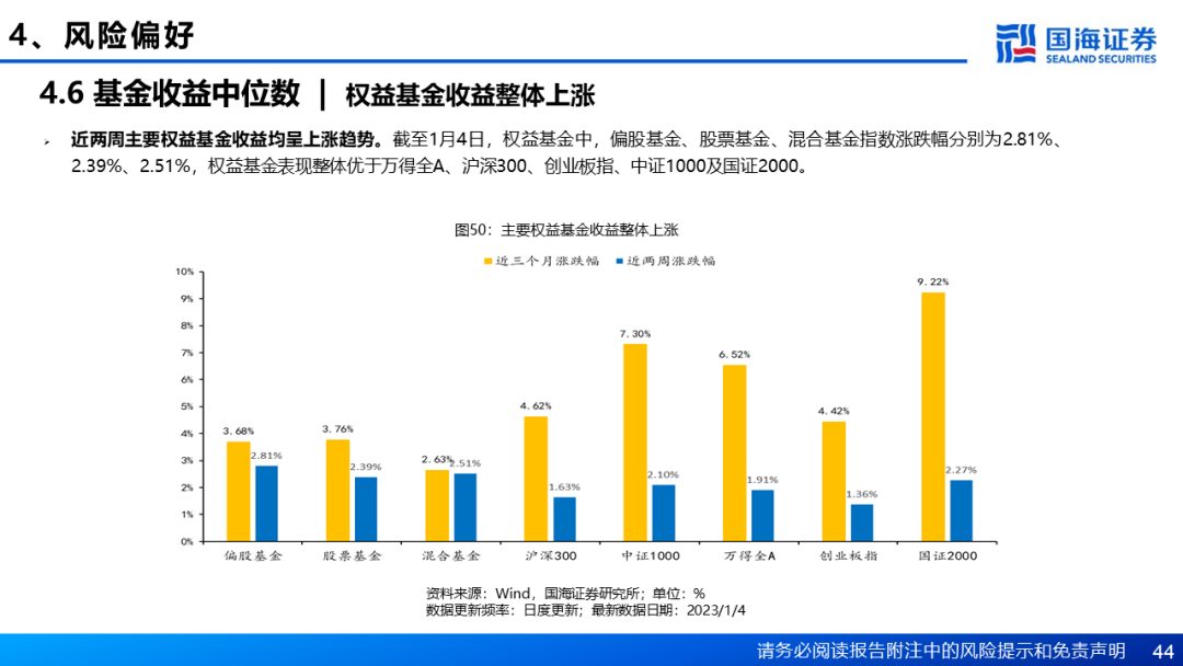 风险偏好方面,近两周A股市场风险偏好回升,截至1月4日,万得全A股权风险溢价为3.08%,相较于两周前下降0.07个百分点。主板与创业板换手率均涨幅明显,创业板指换手率环比两周前上升0.31个百分点,上证综指和沪深300换手率相较于两周前分别上升0.20个百分点和0.16个百分点。海外市场方面,近两周美股市场情绪回落,在衰退预期和美联储加息政策持续的双重影响下,标普500波动率近两周持续上升。日元指数与黄金价格近两周均上涨,1月4日伦敦金价收1857.3美元/盎司,相较两周前上涨2.19%。风险资产方面,近两周比特币价格总体持平,美国高收益企业债收益率整体呈持续上涨趋势。国内权益基金中,近两周偏股基金、股票基金、混合基金指数涨跌幅分别为2.81%、2.39%、2.51%,权益基金表现整体优于宽基指数。
