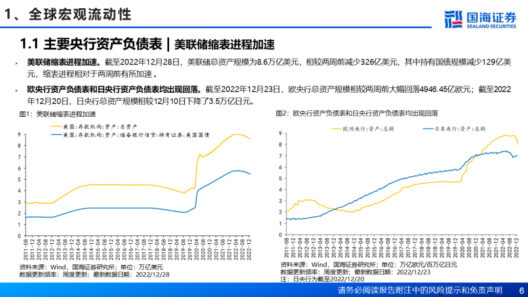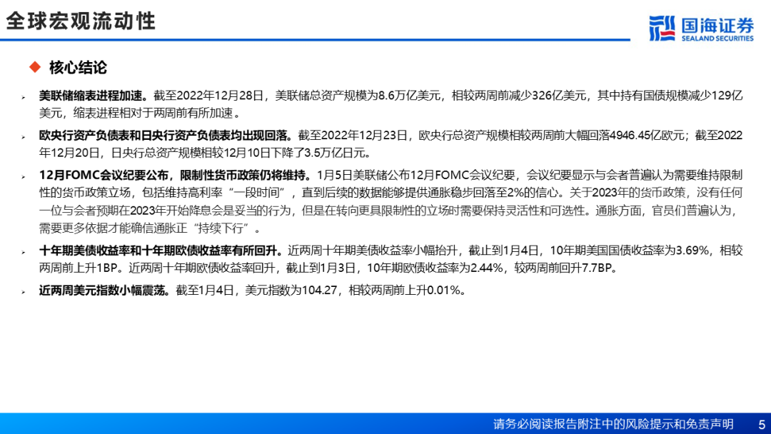 美联储缩表进程加速。截至2022年12月28日,美联储总资产规模为8.6万亿美元,相较两周前减少326亿美元,其中持有国债规模减少129亿美元,缩表进程较两周前有所加速 。