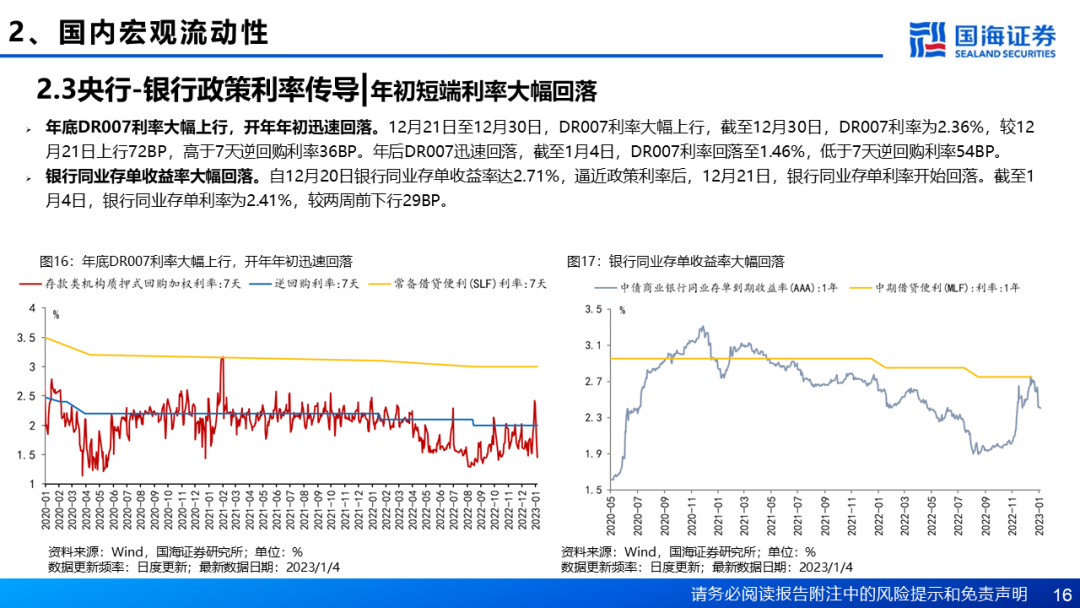 从量上来看,近两周央行延续14天期逆回购,加码7天期逆回购,维护年末流动性平稳。年末年初,为满足机构的跨年资金需求,保持市场流动性合理充裕,稳定市场预期,央行自2022年12月19日重启14天期逆回购操作,12月21日至12月28日,央行连续开展14天期逆回购,累计投放5670亿元,与此同时,近两周央行加码7天期逆回购,2022年12月21日至2023年1月4日累计投放10220亿元,年末年初国内流动性环境维持平稳。