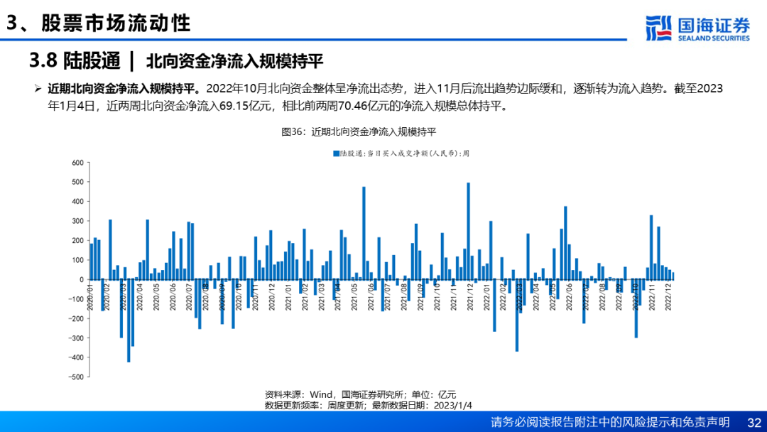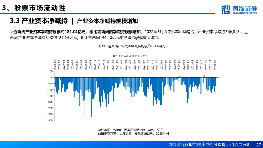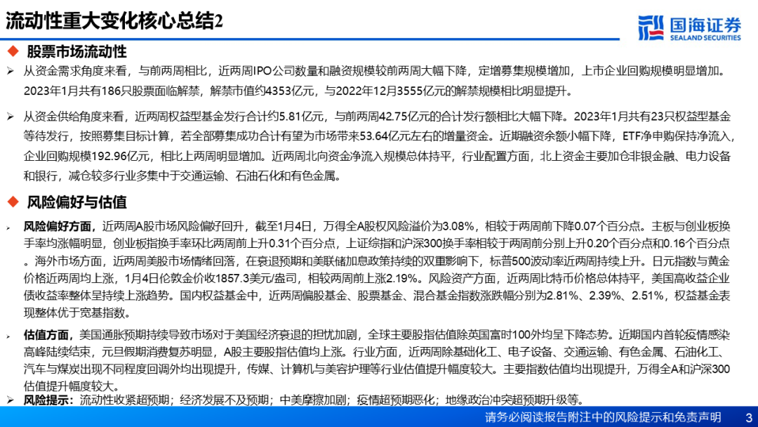从资金供给角度来看,近两周权益型基金发行合计约5.81亿元,与前两周42.75亿元的合计发行额相比大幅下降。2023年1月共有23只权益型基金等待发行,按照募集目标计算,若全部募集成功合计有望为市场带来53.64亿元左右的增量资金。近期融资余额小幅下降,ETF净申购保持净流入,企业回购规模192.96亿元,相比上两周明显增加。近两周北向资金净流入规模总体持平,行业配置方面,北上资金主要加仓非银金融、电力设备和银行,减仓较多行业多集中于交通运输、石油石化和有色金属。