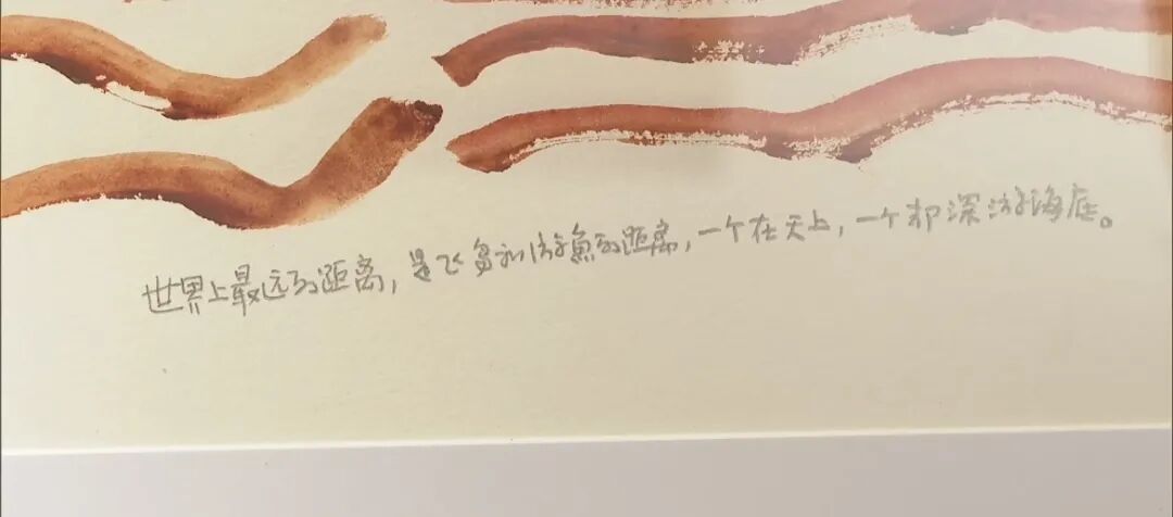 这幅画上几个线条,粗糙的褐色不规则线条构成了几只形同大鸟一样的物件。稀稀拉拉的线条下面有一行解说:世界上最远的距离,是飞鸟和游鱼的距离。一个在天上,一个却深游海底。