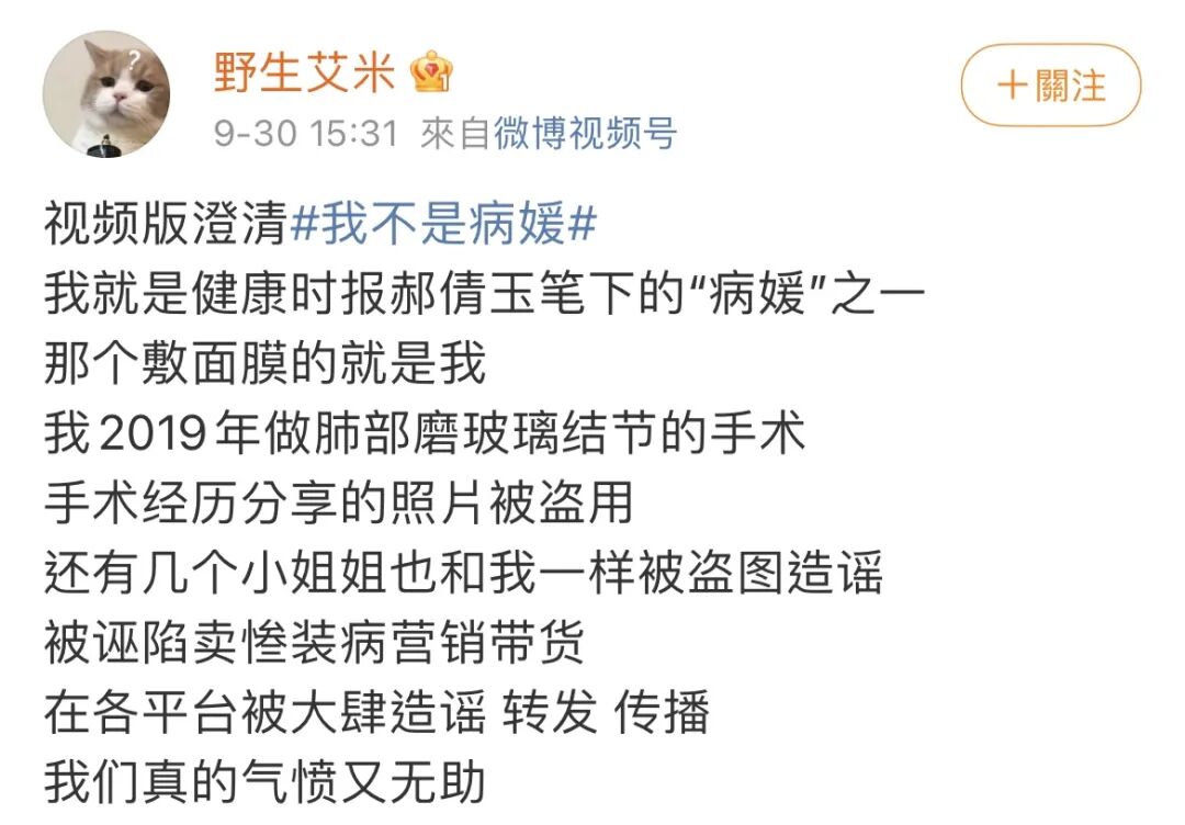 可是很快,这两天一篇“我不是病媛”的澄清登上热搜。被爆料的博主主动出来解释,自己并不是网红,而是一介素人。