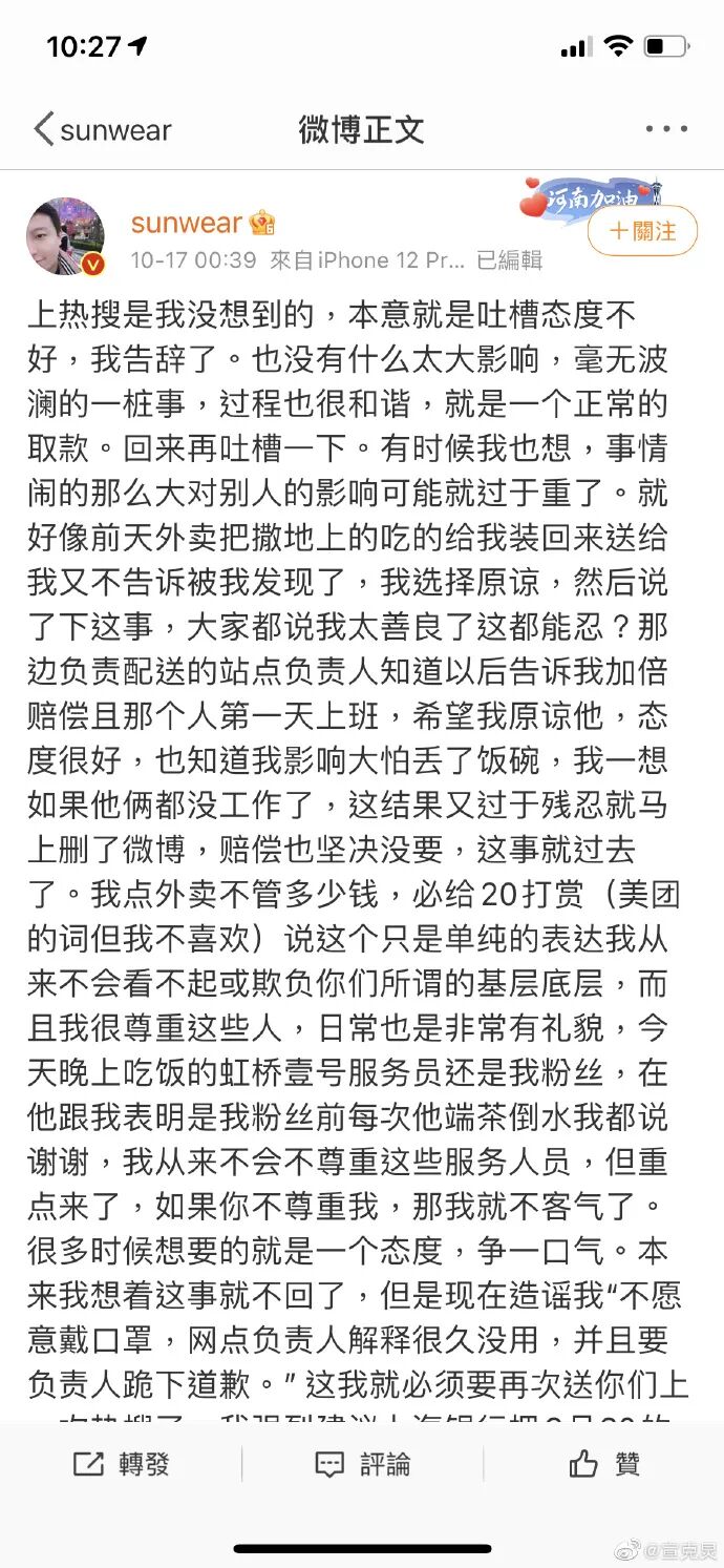 随后其又发文表示:“口罩这事挺有意思,我很尊重遵守防疫规定,但的确出门没带,到了门口我说忘了,直接摆手轰我,如果你觉得这样有礼貌很对就别说了。我问你们这有么没有我马上隔壁就去买了一个。完全的配合结果里面员工口罩都挂在下巴上。”