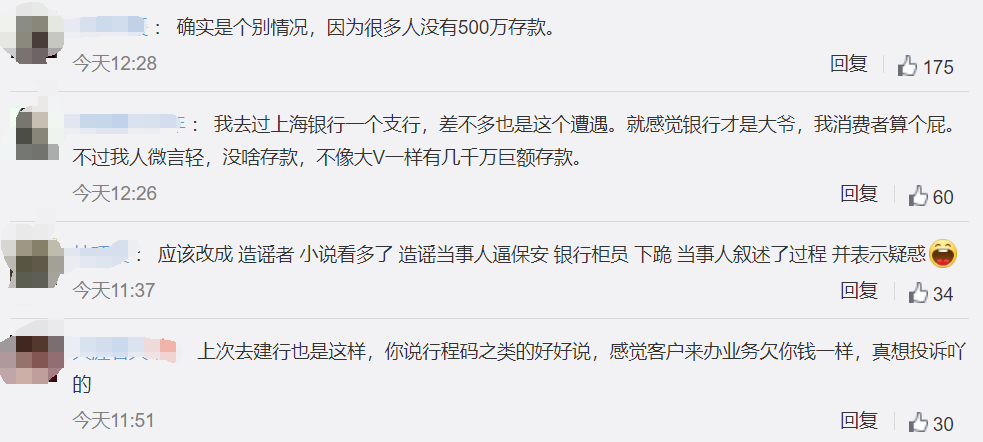 17日,上海银行工作人员回复称,的确有这样的事情发生,但也是个别现象。具体情况不是很清楚,已反馈专员跟进处理。有网友质疑博主疫情期间去网点不愿意戴口罩,其本人否认,并且叙述了事发经过。