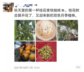 俗话说“八月桂花开满地”,然而今年的桂花似乎比往年来晚了一个月。即便如此,也挡不住人们“金秋赏桂”的闲情雅致。伴随着浓郁的桂花香,好多人纷纷在朋友圈里打卡称“闻到了桂花香”,“窗前桂花已经开满枝头”等。朋友圈里刷屏的不在是“秋天的第一杯奶茶”,而是成了“秋天第一杯桂花拿铁咖啡”。