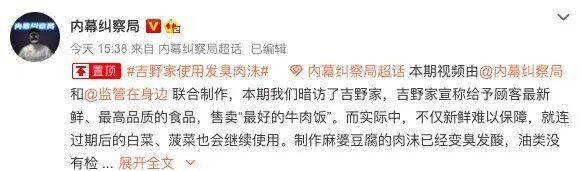 昨天,自媒体博主@内幕纠察局 和 @监管在身边 联合对它进行暗访发现食品卫生存疑,这家店或许也面临“塌房”...#吉野家使用发臭肉沫#一度登上登上热搜,阅读量高达9000多万。在视频中,博主暗访发现:吉野家使用的菠菜和大白菜生产日期标注的是10月29日,保质期为4天。然而,记者的暗访日期是11月3日,这些蔬菜显然已经过期了。