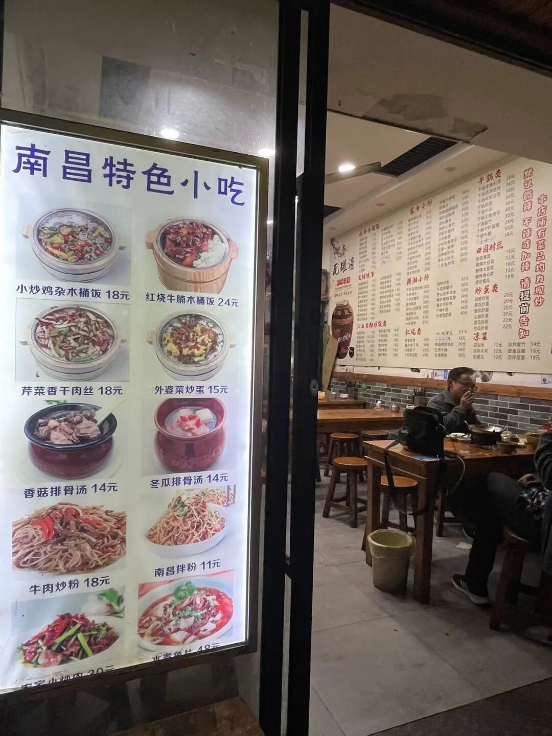 看看这家江西菜,地道啊。红烧牛腩木桶饭24元、小炒鸡杂木桶饭18元、南昌拌粉11元、牛肉炒粉18元、外婆炒鸡蛋15元、芹菜香干肉丝18元、水煮鱼片48元、折骨肉烧荷包蛋48元、香焖炉鱼46元、毛血旺58元......这样的价格不能说特别便宜,但也绝对算是平民价了。大部分蓝村路上的餐馆都差不多这个价。